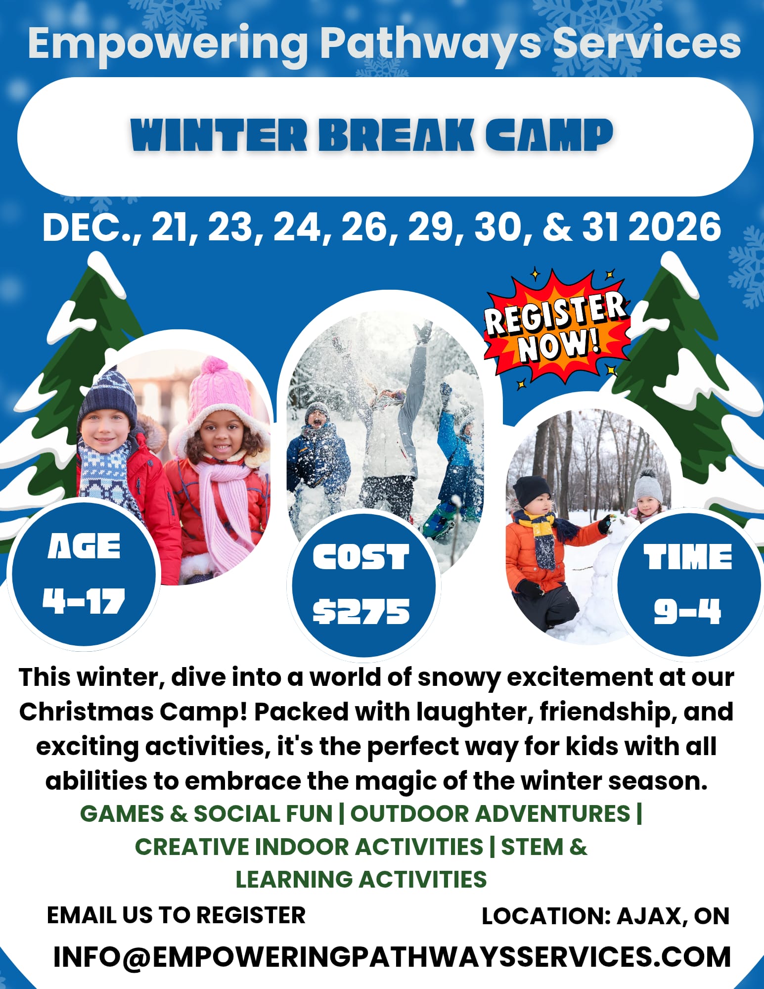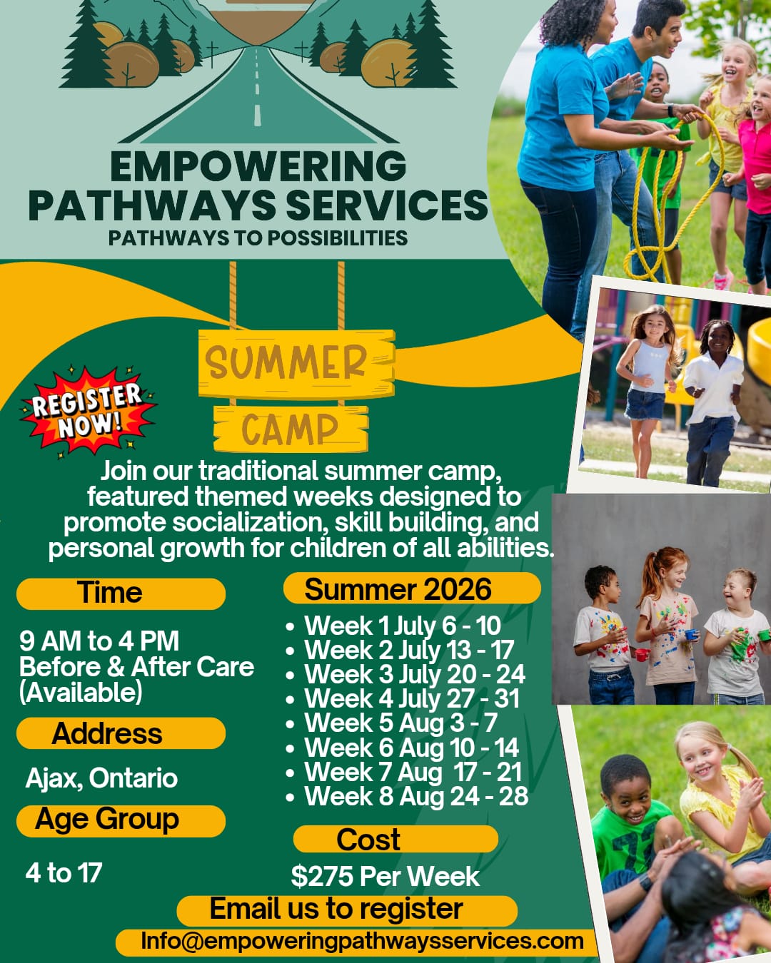 At Empowering Pathways Services, our camps provide a safe, fun, and supportive environment where children and youth can learn, grow, and thrive. Led by experienced staff, our programs include Overnight Camp, Summer Camp, March Break Camp, Winter Break Camp, P.A. Day Camp, and an After-School Program all designed to spark creativity, build skills, and encourage friendship.